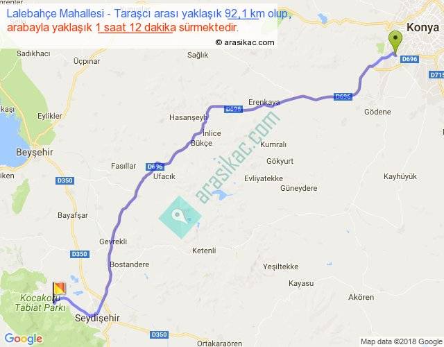 Lalebahçe Mahallesi - Taraşcı arası yaklaşık olarak 90 km/h ile yukarıda belirtilen sürede olup, iki yerin kuş uçuşu uzaklığı (mesafesi) 73'dir. Yolculuk otobüsle 1 saat 33 dakika sürmektedir.