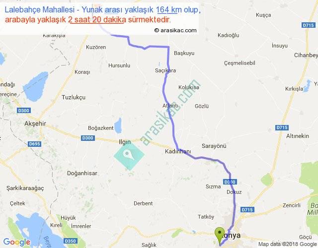 Lalebahçe Mahallesi - Yunak arası yaklaşık olarak 90 km/h ile yukarıda belirtilen sürede olup, iki yerin kuş uçuşu uzaklığı (mesafesi) 125'dir. Yolculuk otobüsle 3 saat 2 dakika sürmektedir.