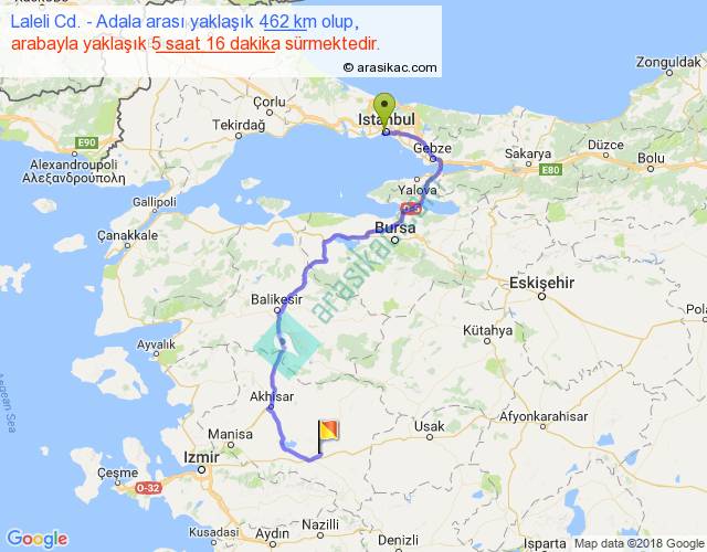 Laleli Cd. - Adala arası yaklaşık olarak 90 km/h ile yukarıda belirtilen sürede olup, iki yerin kuş uçuşu uzaklığı (mesafesi) 277'dir. Eğer belirtilen yerler arasında uçak seferi var ise bu süre uçakla 25 dakika'ya kadar düşebilir. Yolculuk otobüsle 6 saat 50 dakika sürmektedir.
