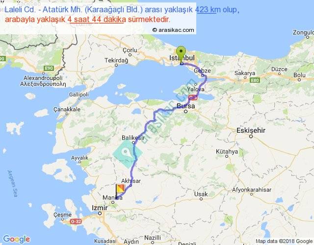 Laleli Cd. - Atatürk Mh. (Karaağaçlı Bld.) arası yaklaşık olarak 90 km/h ile yukarıda belirtilen sürede olup, iki yerin kuş uçuşu uzaklığı (mesafesi) 285'dir. Eğer belirtilen yerler arasında uçak seferi var ise bu süre uçakla 26 dakika'ya kadar düşebilir. Yolculuk otobüsle 6 saat 9 dakika sürmektedir.