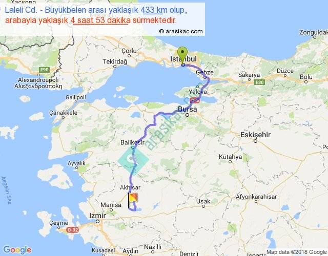 Laleli Cd. - Büyükbelen arası yaklaşık olarak 90 km/h ile yukarıda belirtilen sürede olup, iki yerin kuş uçuşu uzaklığı (mesafesi) 279'dir. Eğer belirtilen yerler arasında uçak seferi var ise bu süre uçakla 25 dakika'ya kadar düşebilir. Yolculuk otobüsle 6 saat 20 dakika sürmektedir.