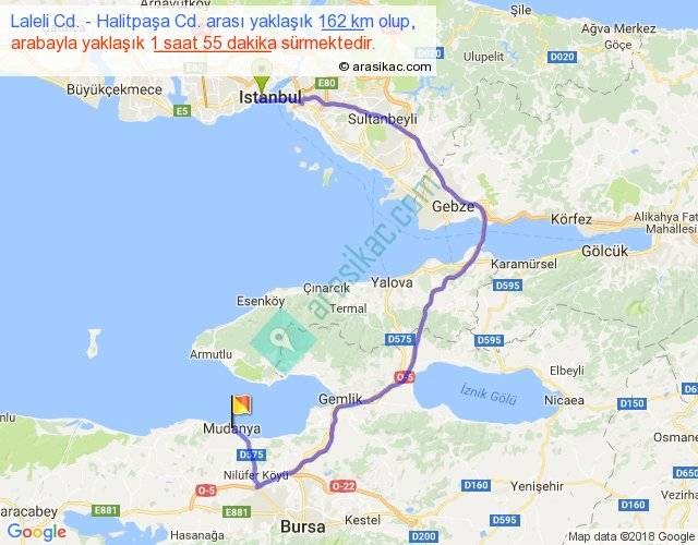 Laleli Cd. - Halitpaşa Cd. arası yaklaşık olarak 90 km/h ile yukarıda belirtilen sürede olup, iki yerin kuş uçuşu uzaklığı (mesafesi) 70'dir. Yolculuk otobüsle 2 saat 29 dakika sürmektedir.