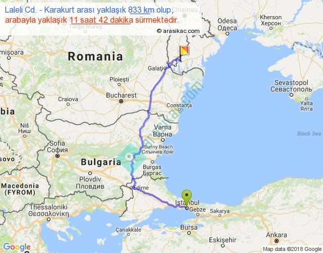 Laleli Cd. - Karakurt arası yaklaşık olarak 90 km/h ile yukarıda belirtilen sürede olup, iki yerin kuş uçuşu uzaklığı (mesafesi) 513'dir. Eğer belirtilen yerler arasında uçak seferi var ise bu süre uçakla 47 dakika'ya kadar düşebilir. Yolculuk otobüsle 15 saat 12 dakika sürmektedir.