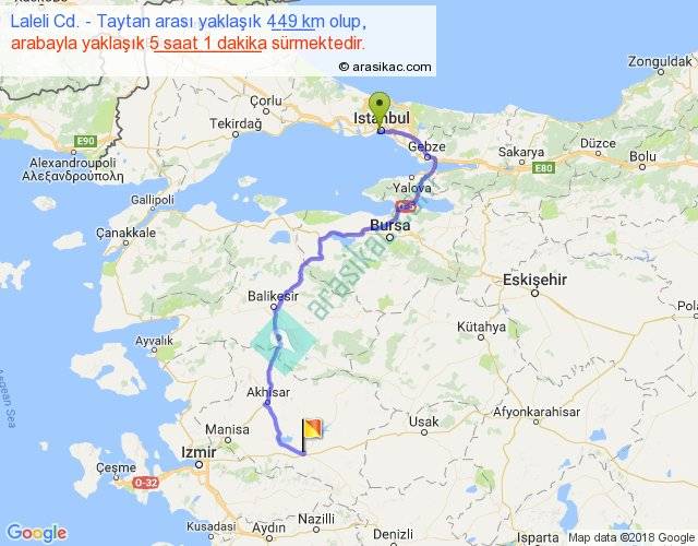 Laleli Cd. - Taytan arası yaklaşık olarak 90 km/h ile yukarıda belirtilen sürede olup, iki yerin kuş uçuşu uzaklığı (mesafesi) 282'dir. Eğer belirtilen yerler arasında uçak seferi var ise bu süre uçakla 26 dakika'ya kadar düşebilir. Yolculuk otobüsle 6 saat 31 dakika sürmektedir.
