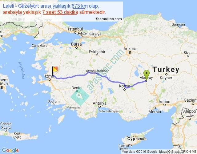 Laleli - Güzelyurt arası yaklaşık olarak 90 km/h ile yukarıda belirtilen sürede olup, iki yerin kuş uçuşu uzaklığı (mesafesi) 577'dir. Eğer belirtilen yerler arasında uçak seferi var ise bu süre uçakla 53 dakika'ya kadar düşebilir. Yolculuk otobüsle 10 saat 14 dakika sürmektedir.