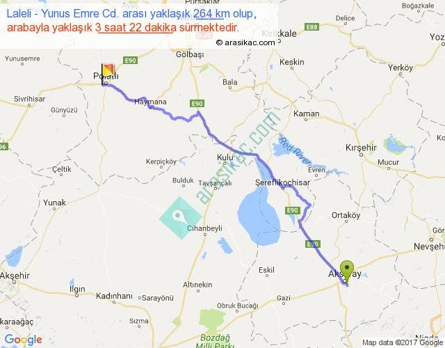 Laleli - Yunus Emre Cd. arası yaklaşık olarak 90 km/h ile yukarıda belirtilen sürede olup, iki yerin kuş uçuşu uzaklığı (mesafesi) 214'dir. Yolculuk otobüsle 4 saat 22 dakika sürmektedir.