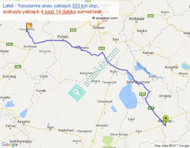 Laleli - Yunusemre arası yaklaşık olarak 90 km/h ile yukarıda belirtilen sürede olup, iki yerin kuş uçuşu uzaklığı (mesafesi) 267'dir. Eğer belirtilen yerler arasında uçak seferi var ise bu süre uçakla 24 dakika'ya kadar düşebilir. Yolculuk otobüsle 5 saat 30 dakika sürmektedir.