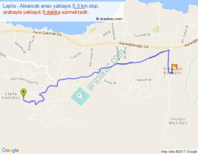 Lapta - Alsancak arası yaklaşık olarak 90 km/h ile yukarıda belirtilen sürede olup, iki yerin kuş uçuşu uzaklığı (mesafesi) 4'dir. Yolculuk otobüsle 11 dakika sürmektedir.