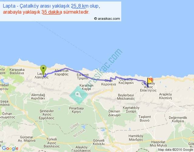 Lapta - Çatalköy arası yaklaşık olarak 90 km/h ile yukarıda belirtilen sürede olup, iki yerin kuş uçuşu uzaklığı (mesafesi) 22'dir. Yolculuk otobüsle 45 dakika sürmektedir.