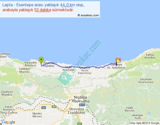 Lapta - Esentepe arası yaklaşık olarak 90 km/h ile yukarıda belirtilen sürede olup, iki yerin kuş uçuşu uzaklığı (mesafesi) 37'dir. Yolculuk otobüsle 1 saat 8 dakika sürmektedir.