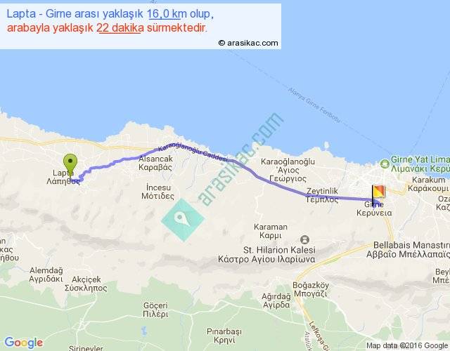 Lapta - Girne arası yaklaşık olarak 90 km/h ile yukarıda belirtilen sürede olup, iki yerin kuş uçuşu uzaklığı (mesafesi) 13'dir. Yolculuk otobüsle 28 dakika sürmektedir.