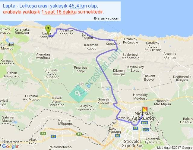 Lapta - Lefkoşa arası yaklaşık olarak 90 km/h ile yukarıda belirtilen sürede olup, iki yerin kuş uçuşu uzaklığı (mesafesi) 26'dir. Yolculuk otobüsle 1 saat 38 dakika sürmektedir.