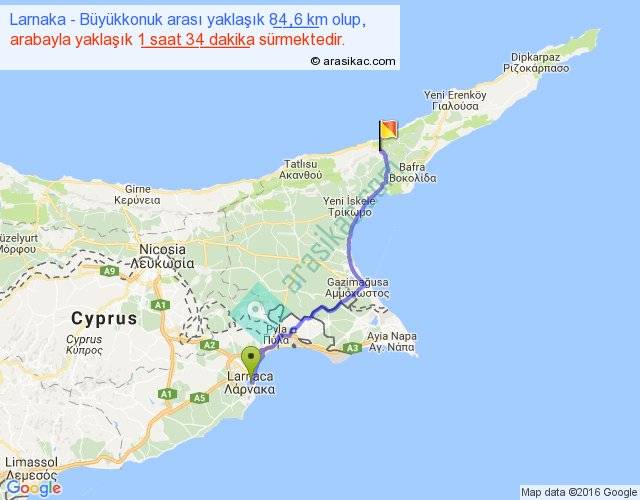 Larnaka - Büyükkonuk arası yaklaşık olarak 90 km/h ile yukarıda belirtilen sürede olup, iki yerin kuş uçuşu uzaklığı (mesafesi) 66'dir. Yolculuk otobüsle 2 saat 2 dakika sürmektedir.