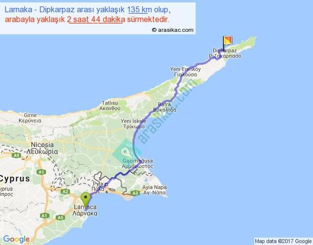 Larnaka - Dipkarpaz arası yaklaşık olarak 90 km/h ile yukarıda belirtilen sürede olup, iki yerin kuş uçuşu uzaklığı (mesafesi) 107'dir. Yolculuk otobüsle 3 saat 33 dakika sürmektedir.