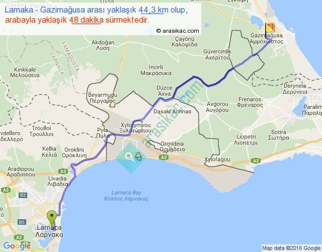 Larnaka - Gazimağusa arası yaklaşık olarak 90 km/h ile yukarıda belirtilen sürede olup, iki yerin kuş uçuşu uzaklığı (mesafesi) 35'dir. Yolculuk otobüsle 1 saat 2 dakika sürmektedir.
