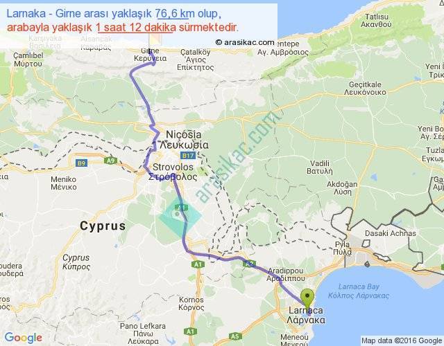 Larnaka - Girne arası yaklaşık olarak 90 km/h ile yukarıda belirtilen sürede olup, iki yerin kuş uçuşu uzaklığı (mesafesi) 54'dir. Yolculuk otobüsle 1 saat 33 dakika sürmektedir.