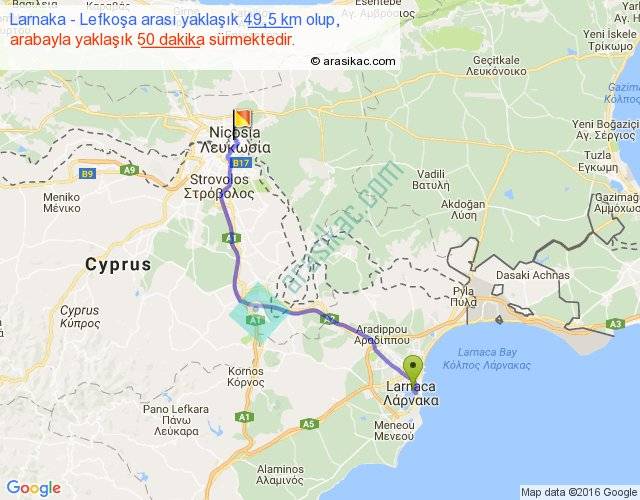 Larnaka - Lefkoşa arası yaklaşık olarak 90 km/h ile yukarıda belirtilen sürede olup, iki yerin kuş uçuşu uzaklığı (mesafesi) 38'dir. Yolculuk otobüsle 1 saat 5 dakika sürmektedir.