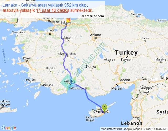 Larnaka - Sakarya arası yaklaşık olarak 90 km/h ile yukarıda belirtilen sürede olup, iki yerin kuş uçuşu uzaklığı (mesafesi) 698'dir. Eğer belirtilen yerler arasında uçak seferi var ise bu süre uçakla 1 saat 04 dakika'ya kadar düşebilir. Yolculuk otobüsle 18 saat 27 dakika sürmektedir.