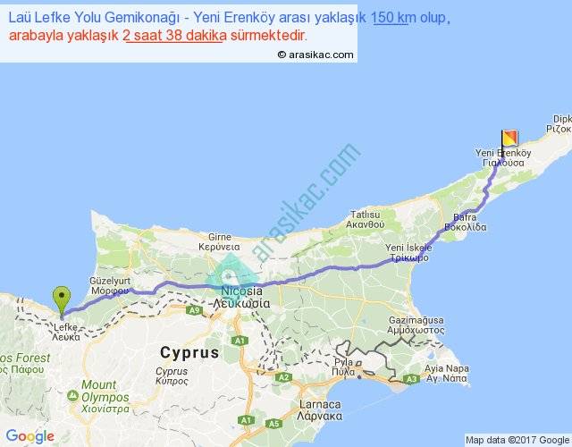 Laü Lefke Yolu Gemikonağı - Yeni Erenköy arası yaklaşık olarak 90 km/h ile yukarıda belirtilen sürede olup, iki yerin kuş uçuşu uzaklığı (mesafesi) 130'dir. Yolculuk otobüsle 3 saat 25 dakika sürmektedir.