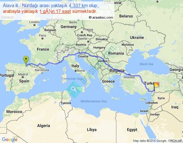 Álava ili - Nurdağı arası yaklaşık olarak 90 km/h ile yukarıda belirtilen sürede olup, iki yerin kuş uçuşu uzaklığı (mesafesi) 3365'dir. Eğer belirtilen yerler arasında uçak seferi var ise bu süre uçakla 5 saat 10 dakika'ya kadar düşebilir. Yolculuk otobüsle 2 gün 5 saat sürmektedir.