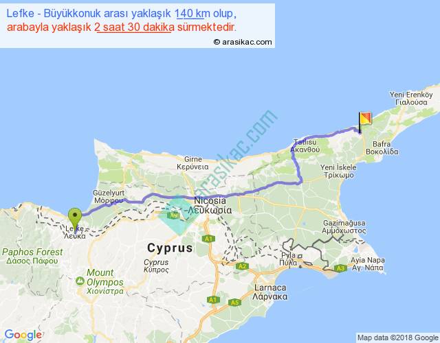 Lefke - Büyükkonuk arası yaklaşık olarak 90 km/h ile yukarıda belirtilen sürede olup, iki yerin kuş uçuşu uzaklığı (mesafesi) 109'dir. Yolculuk otobüsle 3 saat 15 dakika sürmektedir.