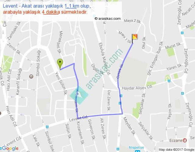 Levent - Akat arası yaklaşık olarak 90 km/h ile yukarıda belirtilen sürede olup, iki yerin kuş uçuşu uzaklığı (mesafesi) 0'dir. Yolculuk otobüsle 5 dakika sürmektedir.