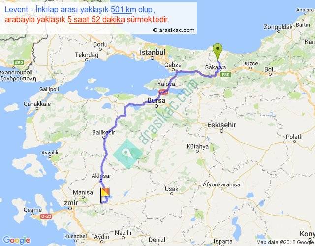 Levent - İnkılap arası yaklaşık olarak 90 km/h ile yukarıda belirtilen sürede olup, iki yerin kuş uçuşu uzaklığı (mesafesi) 348'dir. Eğer belirtilen yerler arasında uçak seferi var ise bu süre uçakla 32 dakika'ya kadar düşebilir. Yolculuk otobüsle 7 saat 37 dakika sürmektedir.