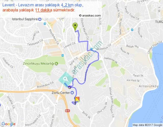 Levent - Levazım arası yaklaşık olarak 90 km/h ile yukarıda belirtilen sürede olup, iki yerin kuş uçuşu uzaklığı (mesafesi) 2'dir. Yolculuk otobüsle 14 dakika sürmektedir.