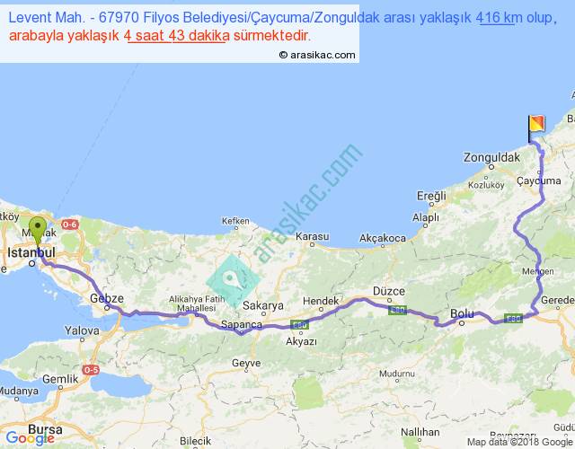 Levent Mah. - 67970 Filyos Belediyesi Çaycuma Zonguldak arası yaklaşık olarak 90 km/h ile yukarıda belirtilen sürede olup, iki yerin kuş uçuşu uzaklığı (mesafesi) 255'dir. Eğer belirtilen yerler arasında uçak seferi var ise bu süre uçakla 23 dakika'ya kadar düşebilir. Yolculuk otobüsle 6 saat 7 dakika sürmektedir.