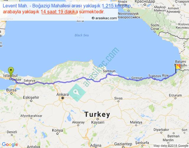 Levent Mah. - Boğaziçi Mahallesi arası yaklaşık olarak 90 km/h ile yukarıda belirtilen sürede olup, iki yerin kuş uçuşu uzaklığı (mesafesi) 1021'dir. Eğer belirtilen yerler arasında uçak seferi var ise bu süre uçakla 1 saat 34 dakika'ya kadar düşebilir. Yolculuk otobüsle 18 saat 36 dakika sürmektedir.
