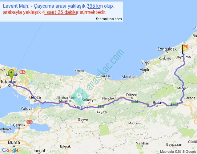 Levent Mah. - Çaycuma arası yaklaşık olarak 90 km/h ile yukarıda belirtilen sürede olup, iki yerin kuş uçuşu uzaklığı (mesafesi) 257'dir. Eğer belirtilen yerler arasında uçak seferi var ise bu süre uçakla 23 dakika'ya kadar düşebilir. Yolculuk otobüsle 5 saat 44 dakika sürmektedir.