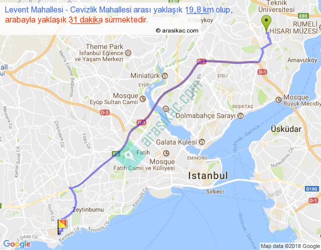Levent Mahallesi - Cevizlik Mahallesi arası yaklaşık olarak 90 km/h ile yukarıda belirtilen sürede olup, iki yerin kuş uçuşu uzaklığı (mesafesi) 17'dir. Yolculuk otobüsle 40 dakika sürmektedir.