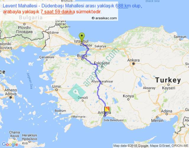 Levent Mahallesi - Düdenbaşı Mahallesi arası yaklaşık olarak 90 km/h ile yukarıda belirtilen sürede olup, iki yerin kuş uçuşu uzaklığı (mesafesi) 484'dir. Eğer belirtilen yerler arasında uçak seferi var ise bu süre uçakla 44 dakika'ya kadar düşebilir. Yolculuk otobüsle 10 saat 22 dakika sürmektedir.