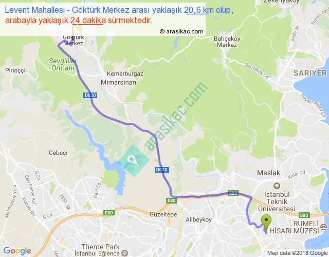 Levent Mahallesi - Göktürk Merkez arası yaklaşık olarak 90 km/h ile yukarıda belirtilen sürede olup, iki yerin kuş uçuşu uzaklığı (mesafesi) 15'dir. Yolculuk otobüsle 31 dakika sürmektedir.