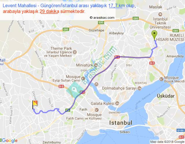 Levent Mahallesi - Güngören İstanbul arası yaklaşık olarak 90 km/h ile yukarıda belirtilen sürede olup, iki yerin kuş uçuşu uzaklığı (mesafesi) 14'dir. Yolculuk otobüsle 37 dakika sürmektedir.