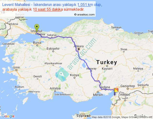 Levent Mahallesi - İskenderun arası yaklaşık olarak 90 km/h ile yukarıda belirtilen sürede olup, iki yerin kuş uçuşu uzaklığı (mesafesi) 791'dir. Eğer belirtilen yerler arasında uçak seferi var ise bu süre uçakla 1 saat 13 dakika'ya kadar düşebilir. Yolculuk otobüsle 14 saat 11 dakika sürmektedir.