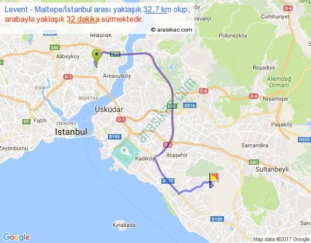 Levent - Maltepe İstanbul arası yaklaşık olarak 90 km/h ile yukarıda belirtilen sürede olup, iki yerin kuş uçuşu uzaklığı (mesafesi) 20'dir. Yolculuk otobüsle 41 dakika sürmektedir.