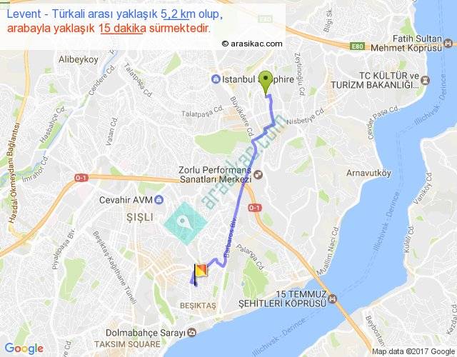Levent - Türkali arası yaklaşık olarak 90 km/h ile yukarıda belirtilen sürede olup, iki yerin kuş uçuşu uzaklığı (mesafesi) 4'dir. Yolculuk otobüsle 19 dakika sürmektedir.