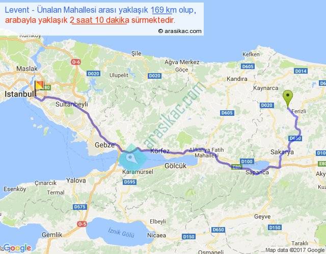 Levent - Ünalan Mahallesi arası yaklaşık olarak 90 km/h ile yukarıda belirtilen sürede olup, iki yerin kuş uçuşu uzaklığı (mesafesi) 114'dir. Yolculuk otobüsle 2 saat 49 dakika sürmektedir.