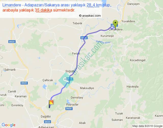 Limandere - Adapazarı Sakarya arası yaklaşık olarak 90 km/h ile yukarıda belirtilen sürede olup, iki yerin kuş uçuşu uzaklığı (mesafesi) 23'dir. Yolculuk otobüsle 45 dakika sürmektedir.