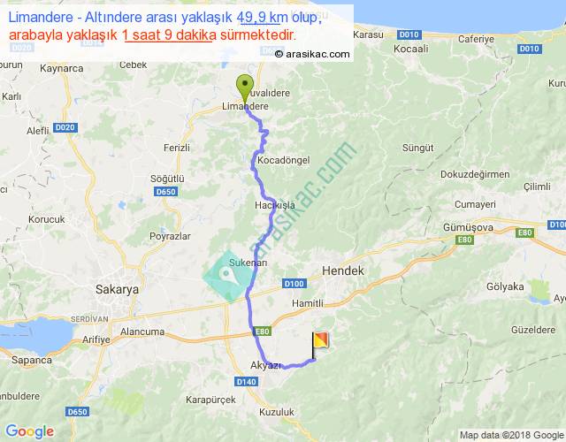 Limandere - Altındere arası yaklaşık olarak 90 km/h ile yukarıda belirtilen sürede olup, iki yerin kuş uçuşu uzaklığı (mesafesi) 34'dir. Yolculuk otobüsle 1 saat 29 dakika sürmektedir.