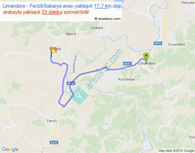 Limandere - Ferizli Sakarya arası yaklaşık olarak 90 km/h ile yukarıda belirtilen sürede olup, iki yerin kuş uçuşu uzaklığı (mesafesi) 9'dir. Yolculuk otobüsle 29 dakika sürmektedir.