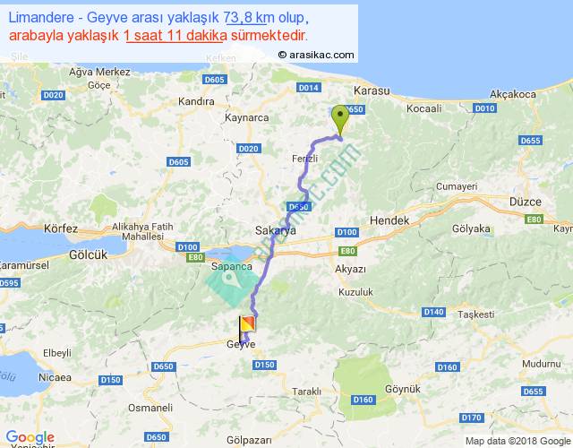 Limandere - Geyve arası yaklaşık olarak 90 km/h ile yukarıda belirtilen sürede olup, iki yerin kuş uçuşu uzaklığı (mesafesi) 59'dir. Yolculuk otobüsle 1 saat 32 dakika sürmektedir.