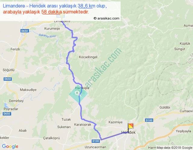 Limandere - Hendek arası yaklaşık olarak 90 km/h ile yukarıda belirtilen sürede olup, iki yerin kuş uçuşu uzaklığı (mesafesi) 25'dir. Yolculuk otobüsle 1 saat 15 dakika sürmektedir.
