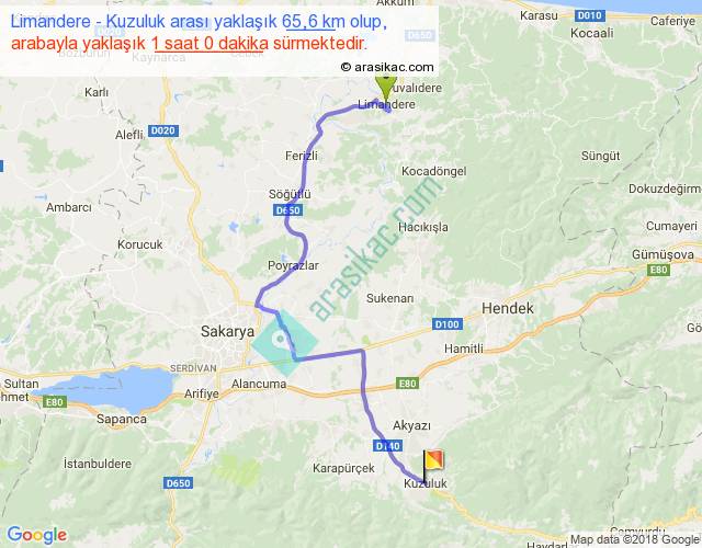 Limandere - Kuzuluk arası yaklaşık olarak 90 km/h ile yukarıda belirtilen sürede olup, iki yerin kuş uçuşu uzaklığı (mesafesi) 40'dir. Yolculuk otobüsle 1 saat 18 dakika sürmektedir.