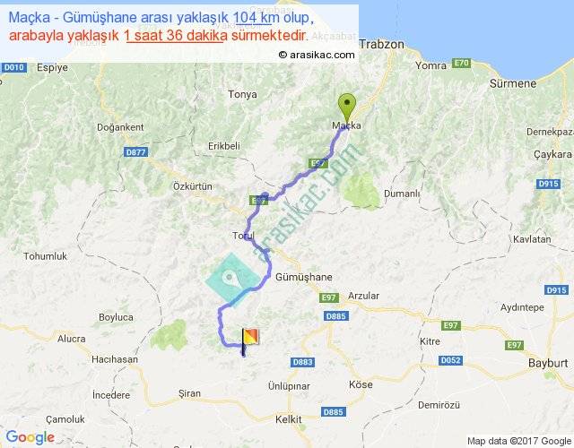 Maçka - Gümüşhane arası yaklaşık olarak 90 km/h ile yukarıda belirtilen sürede olup, iki yerin kuş uçuşu uzaklığı (mesafesi) 65'dir. Yolculuk otobüsle 2 saat 4 dakika sürmektedir.