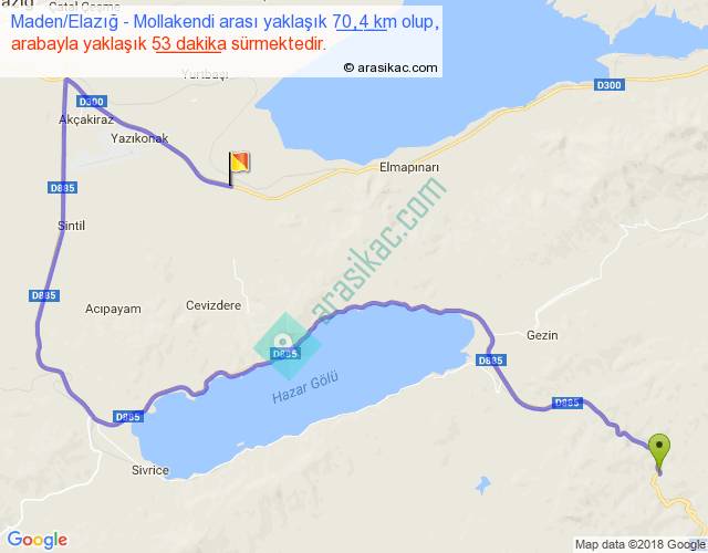 Maden Elazığ - Mollakendi arası yaklaşık olarak 90 km/h ile yukarıda belirtilen sürede olup, iki yerin kuş uçuşu uzaklığı (mesafesi) 28'dir. Yolculuk otobüsle 1 saat 8 dakika sürmektedir.
