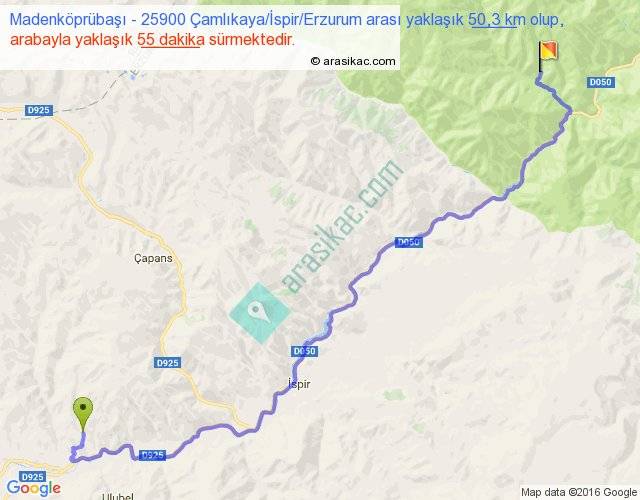 Madenköprübaşı - 25900 Çamlıkaya İspir Erzurum arası yaklaşık olarak 90 km/h ile yukarıda belirtilen sürede olup, iki yerin kuş uçuşu uzaklığı (mesafesi) 34'dir. Yolculuk otobüsle 1 saat 11 dakika sürmektedir.
