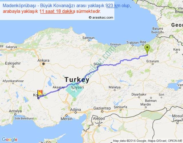 Madenköprübaşı - Büyük Kovanağzı arası yaklaşık olarak 90 km/h ile yukarıda belirtilen sürede olup, iki yerin kuş uçuşu uzaklığı (mesafesi) 775'dir. Eğer belirtilen yerler arasında uçak seferi var ise bu süre uçakla 1 saat 11 dakika'ya kadar düşebilir. Yolculuk otobüsle 14 saat 41 dakika sürmektedir.