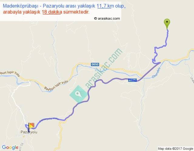 Madenköprübaşı - Pazaryolu arası yaklaşık olarak 90 km/h ile yukarıda belirtilen sürede olup, iki yerin kuş uçuşu uzaklığı (mesafesi) 8'dir. Yolculuk otobüsle 23 dakika sürmektedir.